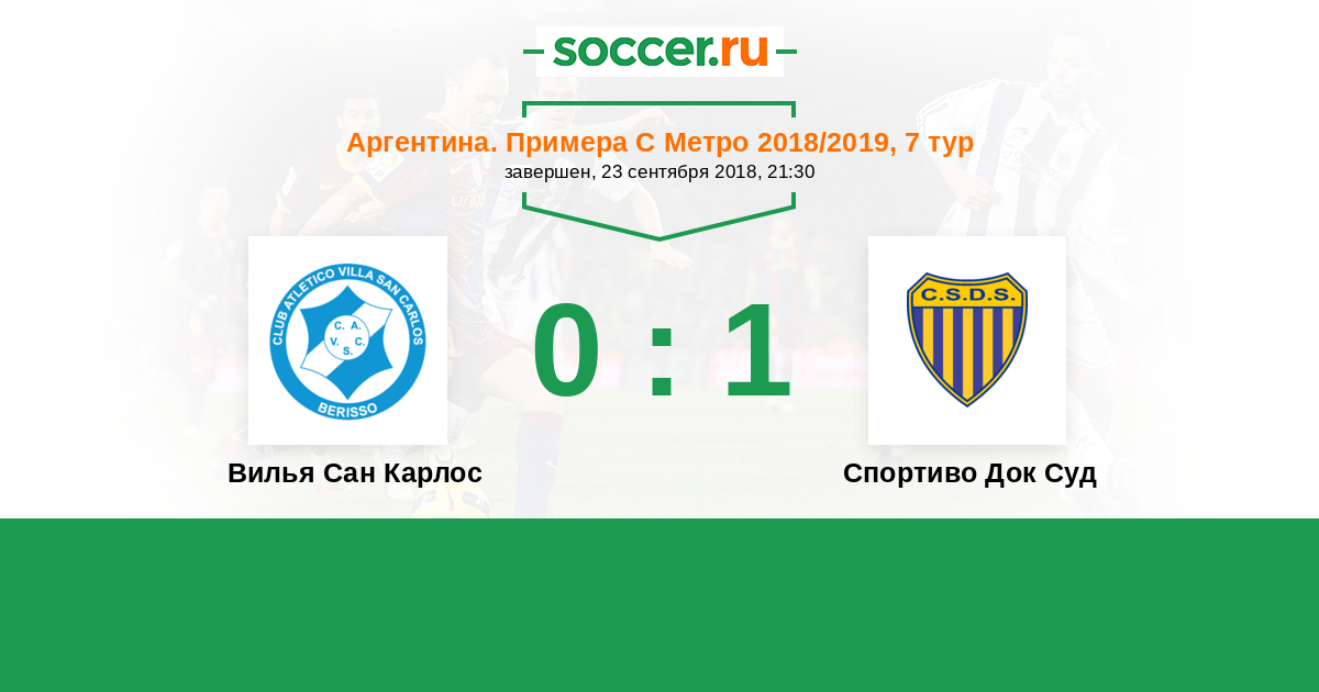 Аргентина. Примера С Метро 01.03.2019 Спортиво Док Суд Логотип футбольный клуб Спортиво Док Суд (Буэнос-Айрес) 0:0 Логотип футбольный клуб Вилья Сан Карлос (Берисо) Вилья Сан Карлос