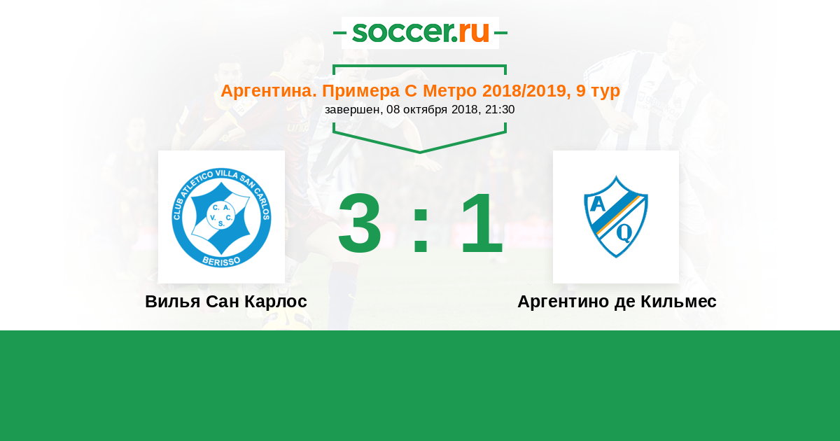 Аргентина. Примера С Метро 16.03.2019 Аргентино де Кильмес Логотип футбольный клуб Аргентино де Кильмес 0:1 Логотип футбольный клуб Вилья Сан Карлос (Берисо) Вилья Сан Карлос