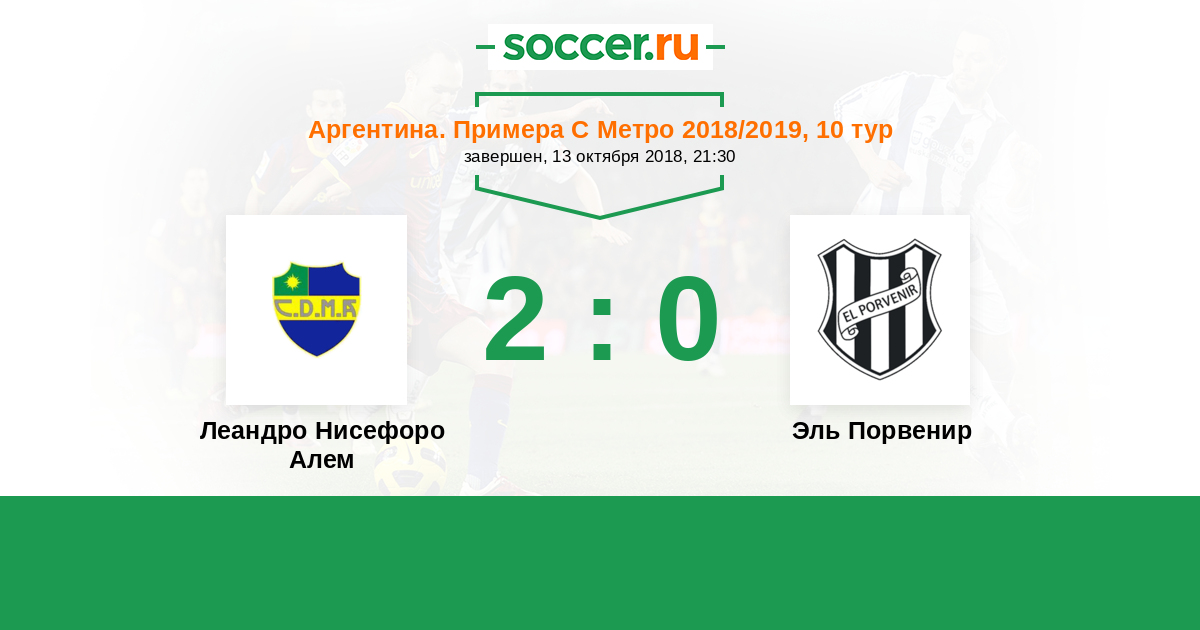 Аргентина. Примера С Метро 18.09.2010 Леандро Нисефоро Алем Логотип футбольный клуб Леандро Нисефоро Алем (Буэнос-Айрес) 0:1 Логотип футбольный клуб Эль Порвенир (Буэнос-Айрес) Эль Порвенир