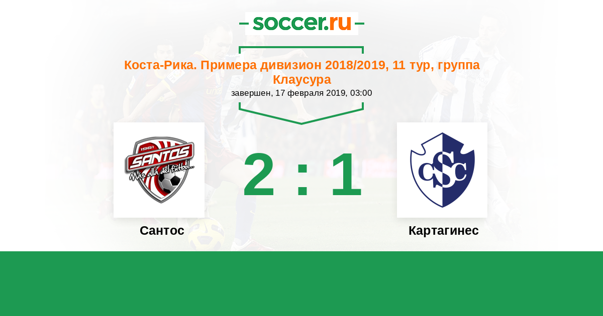 Коста-Рика. Примера дивизион 19.02.2017 Картахинес Логотип футбольный клуб Картахинес (Карфаген) 1:1 Логотип футбольный клуб Сантос (Гуапилес) Сантос