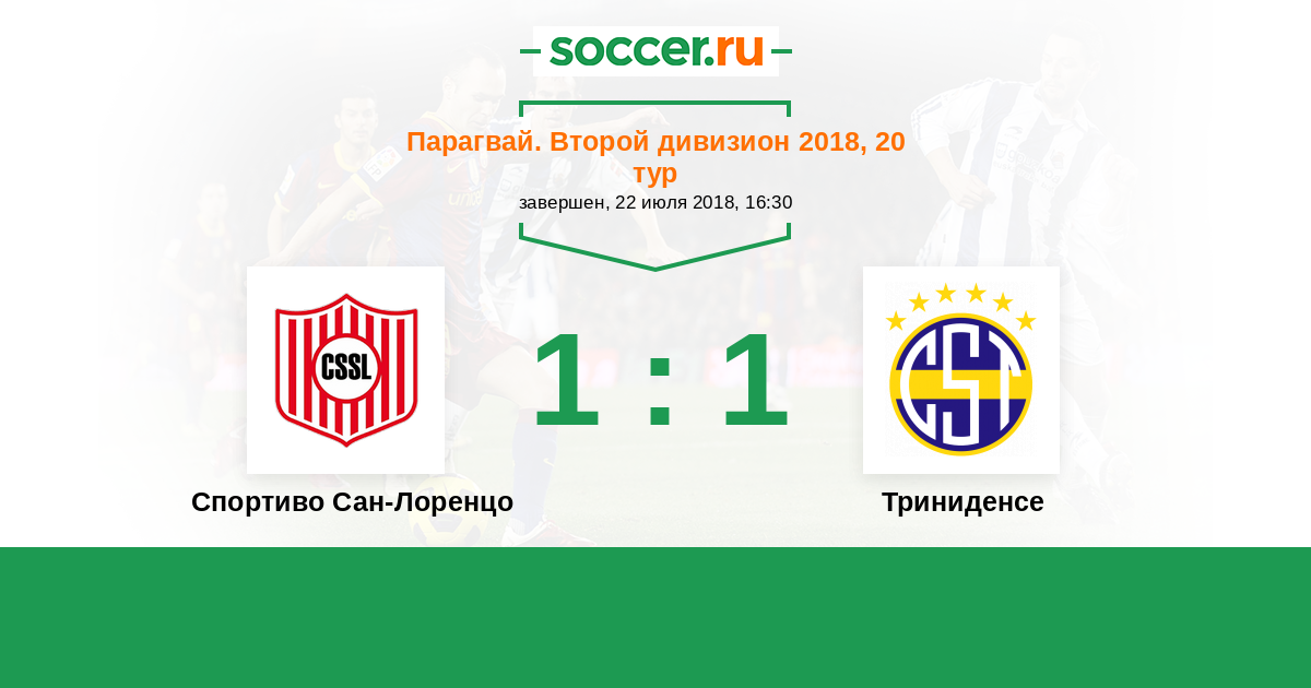 Парагвай. Второй дивизион 30.07.2016 Спортиво Сан-Лоренцо Логотип футбольный клуб Спортиво Сан-Лоренцо 1:1 Логотип футбольный клуб Триниденсе (Асунсьон) Триниденсе