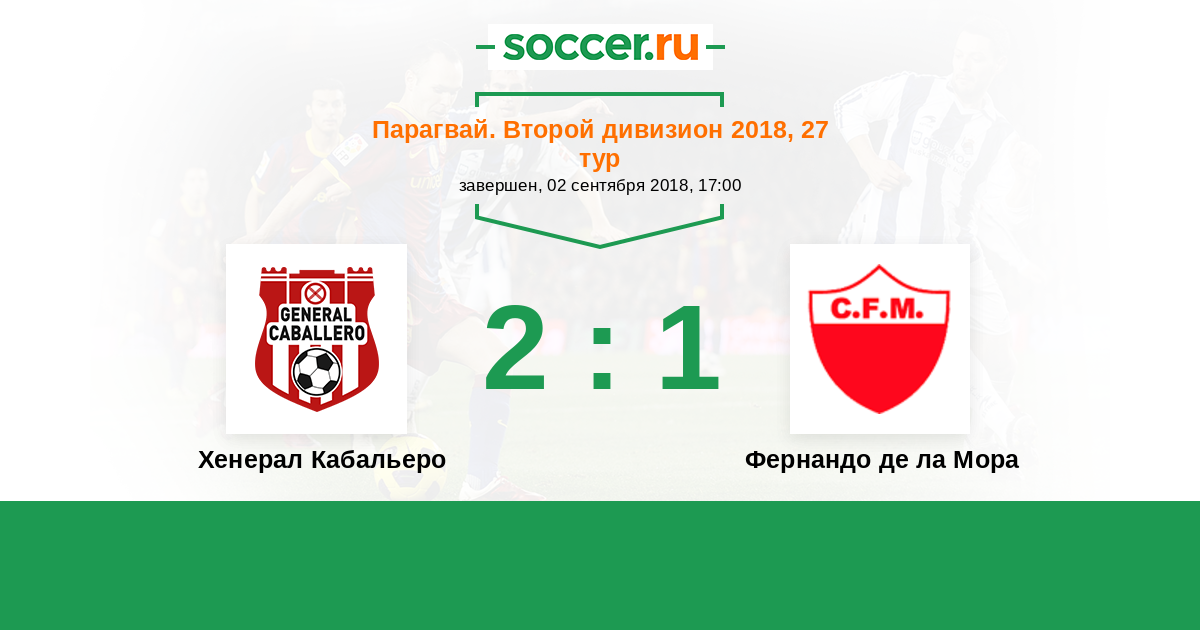 Парагвай. Второй дивизион 10.09.2017 Хенерал Кабальеро Логотип футбольный клуб Хенерал Кабальеро (Доктор-Хуан-Леон-Майоркин) 4:1 Логотип футбольный клуб Фернандо де ла Мора Фернандо де ла Мора