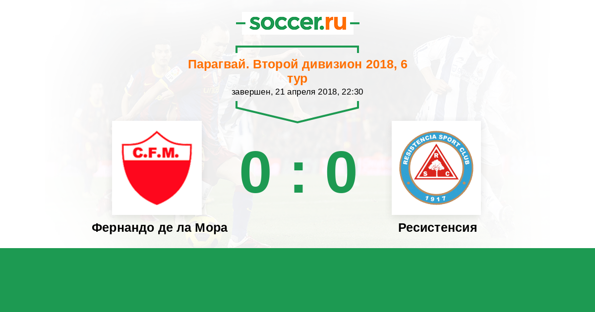 Парагвай. Второй дивизион 29.07.2018 Ресистенсия Логотип футбольный клуб Ресистенсия (Асунсьон) 1:2 Логотип футбольный клуб Фернандо де ла Мора Фернандо де ла Мора