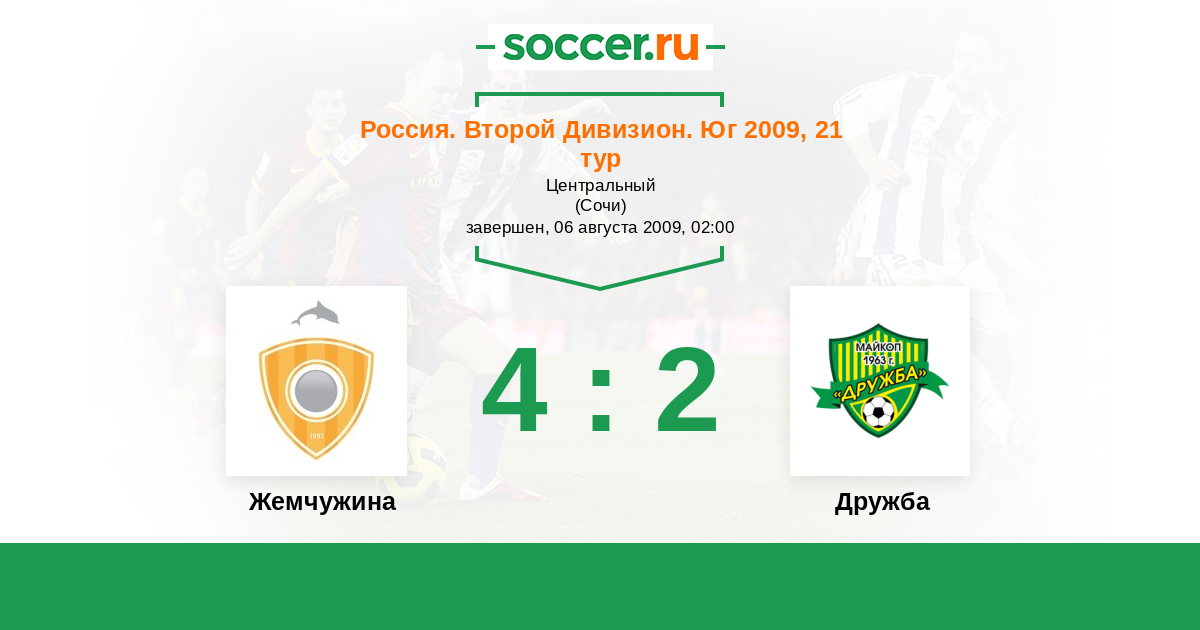Россия. Вторая лига. Группа 1 17.04.2009 Дружба Логотип футбольный клуб Дружба (Майкоп) 1:3 Логотип футбольный клуб Жемчужина (Сочи) Жемчужина