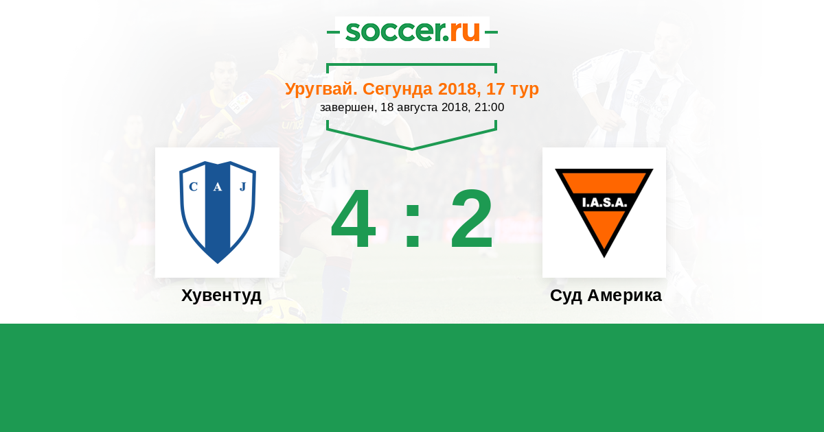 Уругвай. Примера A 17.06.2017 Хувентуд Логотип футбольный клуб Хувентуд (Лас-Пьедрас) 2:2 Логотип футбольный клуб Суд Америка (Монтевидео) Суд Америка