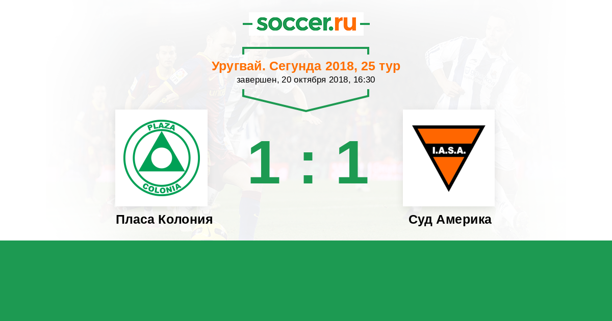 Уругвай. Сегунда 26.05.2018 Суд Америка Логотип футбольный клуб Суд Америка (Монтевидео) 1:1 Логотип футбольный клуб Пласа Колония (Колония-дель-Сакраменто) Пласа Колония