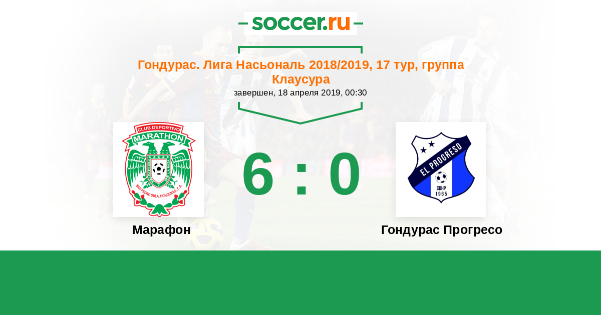 Гондурас. Лига Насьональ 15.04.2018 Марафон Логотип футбольный клуб Марафон (Сан-Педро-Сула) 2:1 Логотип футбольный клуб Гондурас Прогресо (Эль-Прогресо) Гондурас Прогресо