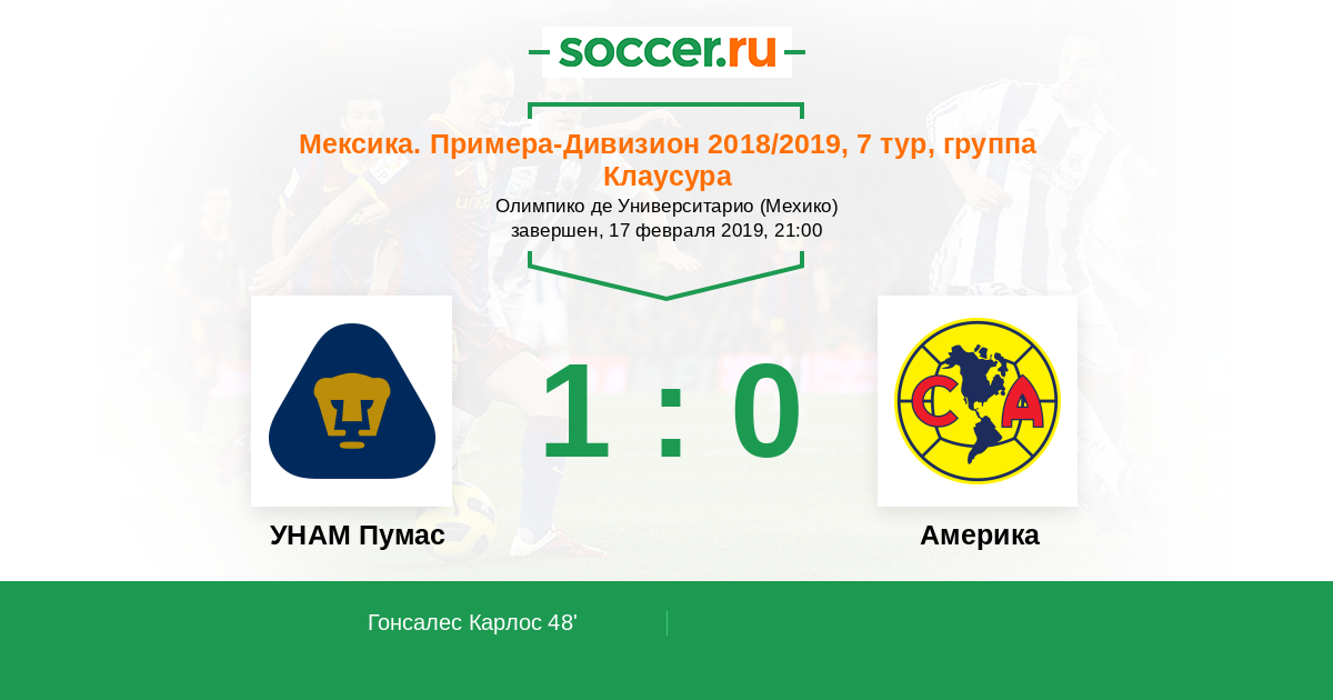 Протокол матча УНАМ Пумас против Америка