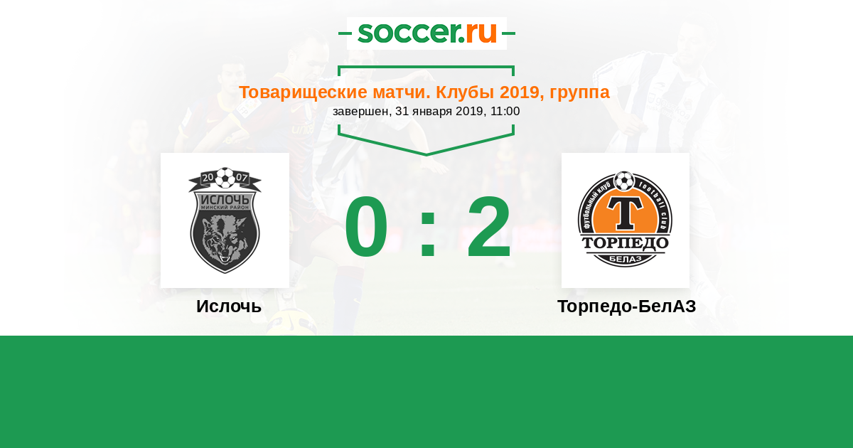 Товарищеские матчи. Клубы 18.02.2016 Торпедо-БелАЗ Логотип футбольный клуб Торпедо-БелАЗ (Жодино) 2:1 Логотип футбольный клуб Ислочь (Минск) Ислочь