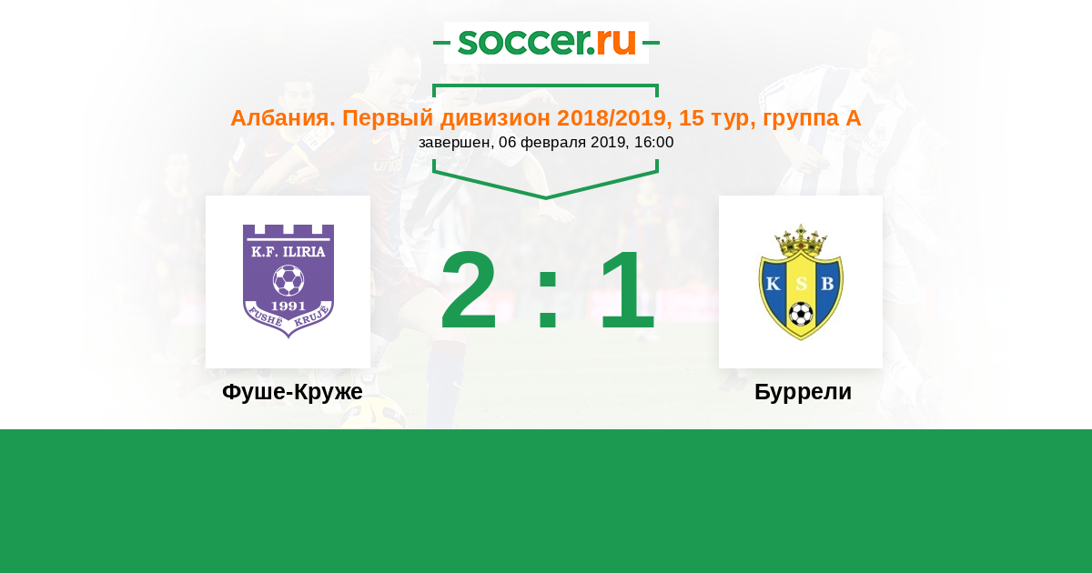 Албания. Первый дивизион 07.03.2015 Фуше-Круже Логотип футбольный клуб Фуше-Круже 3:2 Логотип футбольный клуб Буррели Буррели