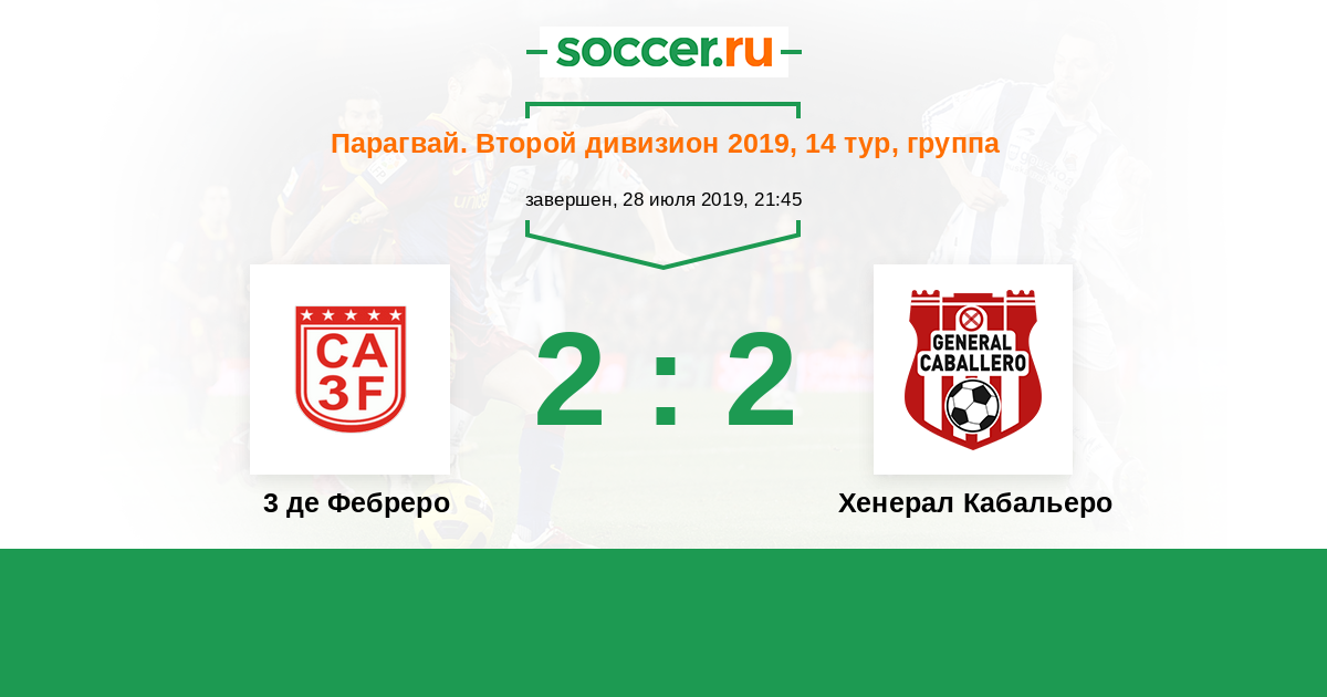 Парагвай. Второй дивизион 19.04.2013 3 де Фебреро Логотип футбольный клуб 3 де Фебреро (Сьюдад-дель-Эсте) 0:0 Логотип футбольный клуб Хенерал Кабальеро (Доктор-Хуан-Леон-Майоркин) Хенерал Кабальеро
