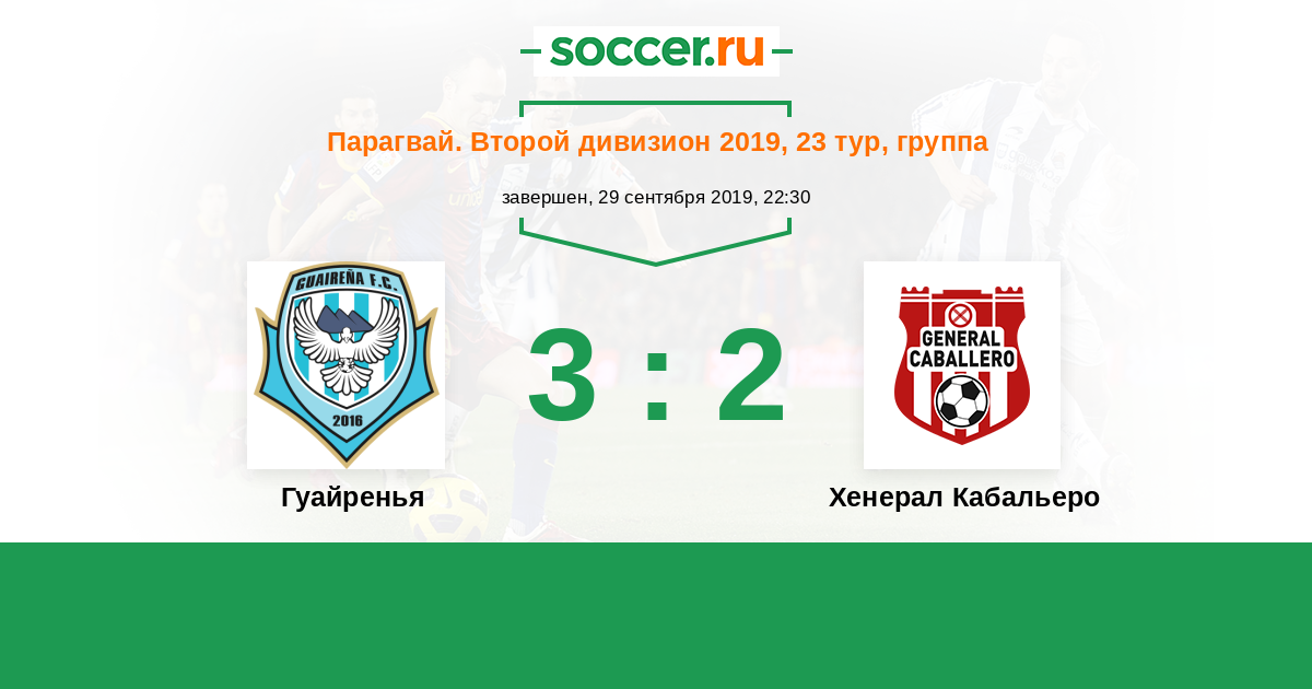 Парагвай. Второй дивизион 16.04.2017 Гуайренья Логотип футбольный клуб Гуайренья (Вильяррика) 3:0 Логотип футбольный клуб Хенерал Кабальеро (Доктор-Хуан-Леон-Майоркин) Хенерал Кабальеро