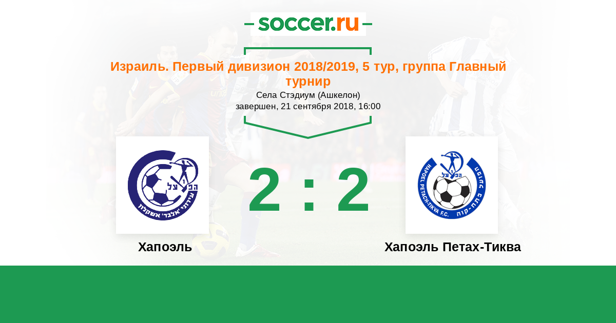 Израиль. Первый дивизион 02.05.2016 Хапоэль Логотип футбольный клуб Хапоэль (Ашкелон) 5:4 Логотип футбольный клуб Хапоэль Петах-Тиква Хапоэль Петах-Тиква
