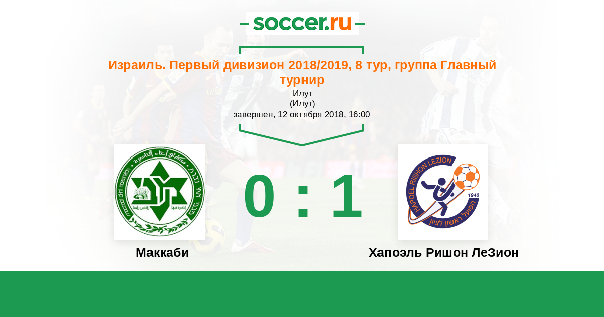 Израиль. Первый дивизион 26.09.2019 Маккаби Логотип футбольный клуб Маккаби (Ахи Назарет) 3:2 Логотип футбольный клуб Хапоэль Ришон ЛеЗион Хапоэль Ришон ЛеЗион