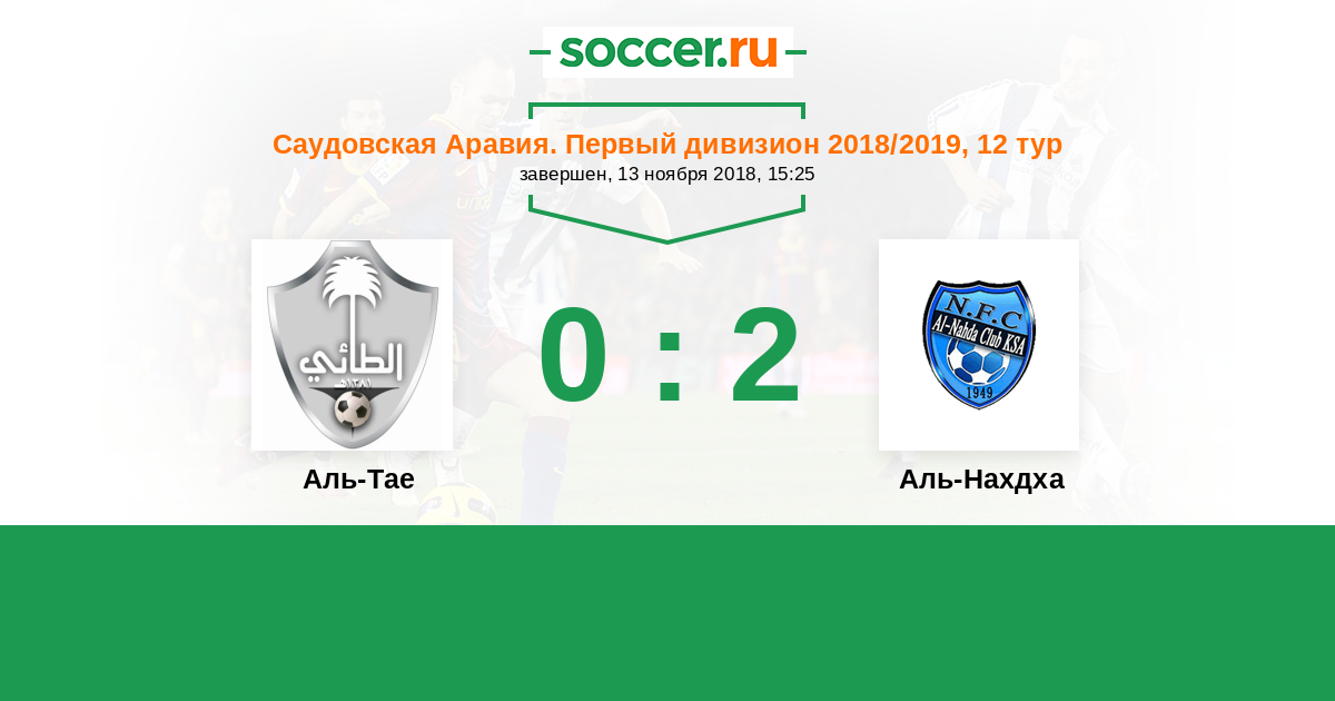 Саудовская Аравия. Первый дивизион 02.04.2019 Аль-Нахдха Логотип футбольный клуб Аль-Нахдха (Эд-Даммам) 2:0 Логотип футбольный клуб Аль-Тае (Хаиль) Аль-Тае