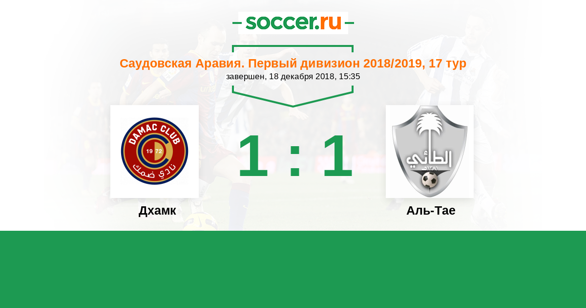 Саудовская Аравия. Первый дивизион 01.11.2017 Дамак Логотип футбольный клуб Дамак (Хамис-Мушайт) 1:1 Логотип футбольный клуб Аль-Тае (Хаиль) Аль-Тае