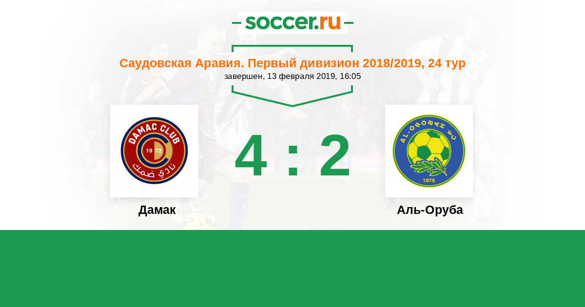 Саудовская Аравия. Первый дивизион 25.09.2018 Аль-Оруба Логотип футбольный клуб Аль-Оруба (Сакака) 0:2 Логотип футбольный клуб Дамак (Хамис-Мушайт) Дамак