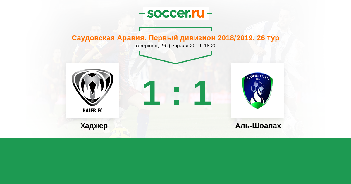 Саудовская Аравия. Первый дивизион 10.10.2018 Аль-Шоалах Логотип футбольный клуб Аль-Шоалах (Эль-Хардж) 0:2 Логотип футбольный клуб Хаджер (Эль-Хофуф) Хаджер