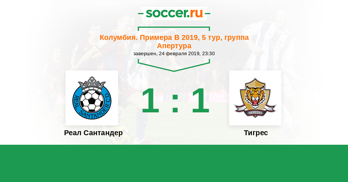 Колумбия. Примера B 18.08.2018 Тигрес Логотип футбольный клуб Тигрес (Сипакира) 1:1 Логотип футбольный клуб Реал Сантандер (Букараманга) Реал Сантандер