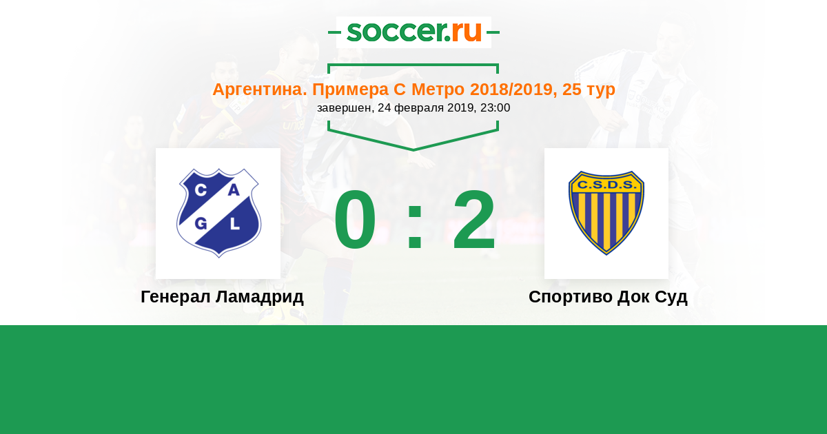Аргентина. Примера С Метро 18.09.2018 Спортиво Док Суд Логотип футбольный клуб Спортиво Док Суд (Буэнос-Айрес) 0:1 Логотип Генерал Ламадрид (Буэнос-Айрес) Генерал Ламадрид