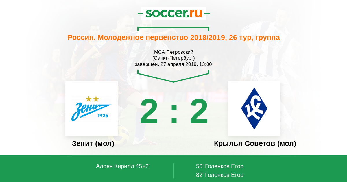 Протокол матча Зенит (мол) против Крылья Советов (мол)