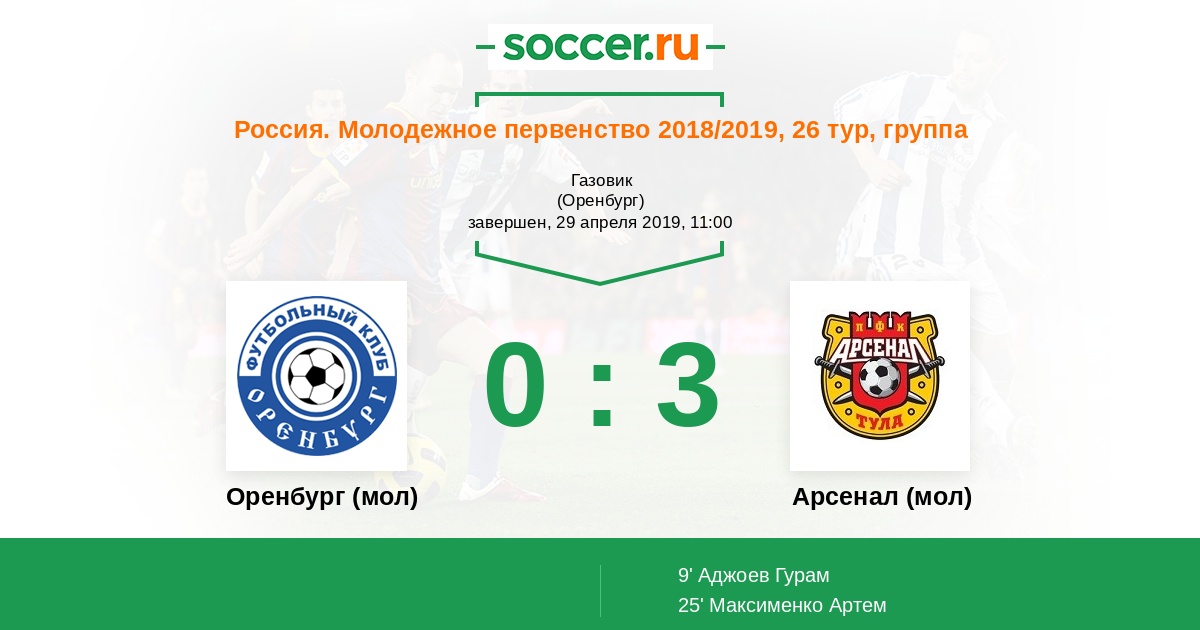 Протокол матча Оренбург (мол) против Арсенал (мол)