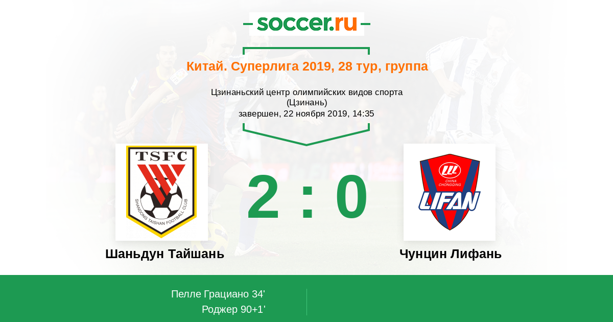 Протокол матча Шаньдун Тайшань против Чунцин Лифань
