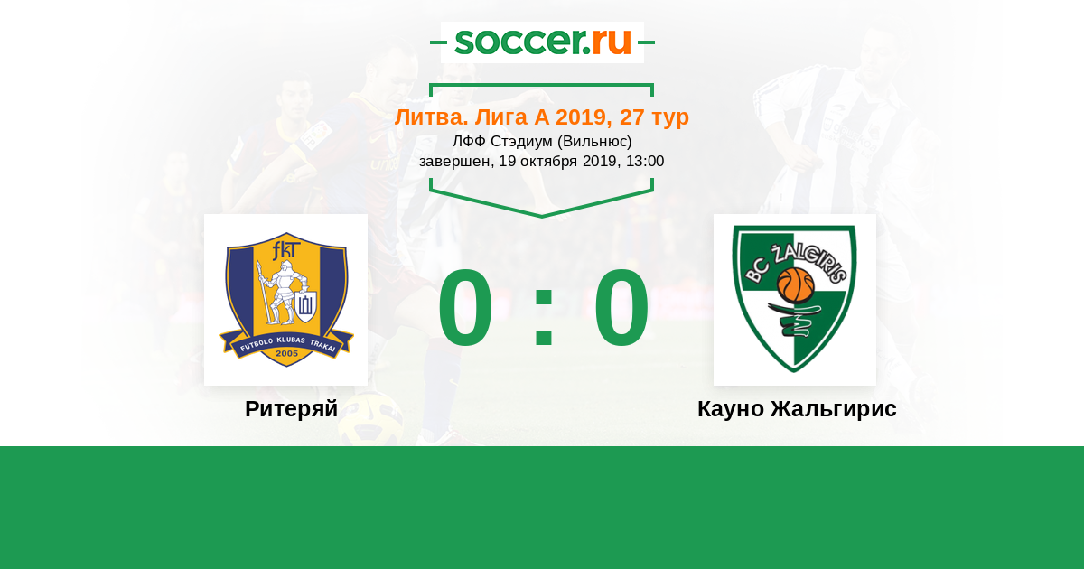 Литва. Лига А 01.06.2019 Ритеряй Логотип футбольный клуб Ритеряй (Тракай) 1:0 Логотип футбольный клуб Кауно Жальгирис (Каунас) Кауно Жальгирис