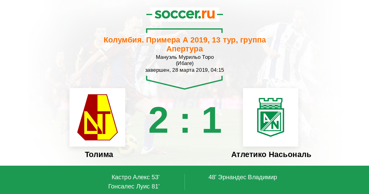 Протокол матча Толима против Атлетико Насьональ