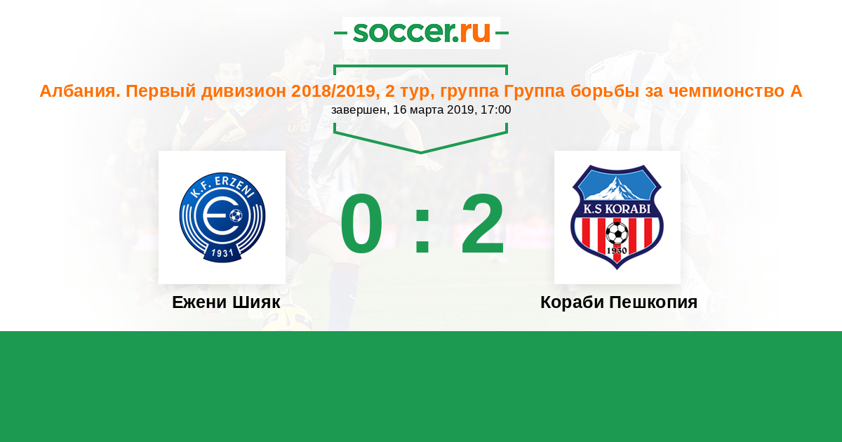 Албания. Первый дивизион 15.09.2018 Кораби Пешкопия Логотип футбольный клуб Кораби Пешкопия 1:0 Логотип футбольный клуб Эрзени Шияк Эрзени Шияк