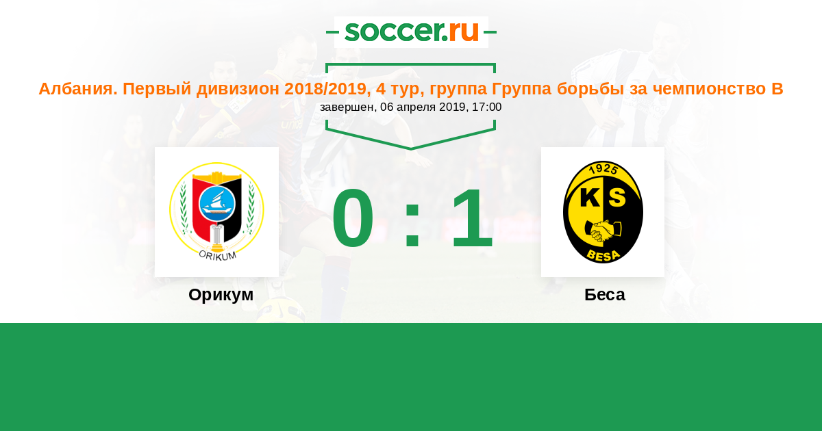 Албания. Первый дивизион 06.04.2019 Орикум Логотип футбольный клуб Орикум 0:1 Логотип футбольный клуб Беса (Кавайе) Беса