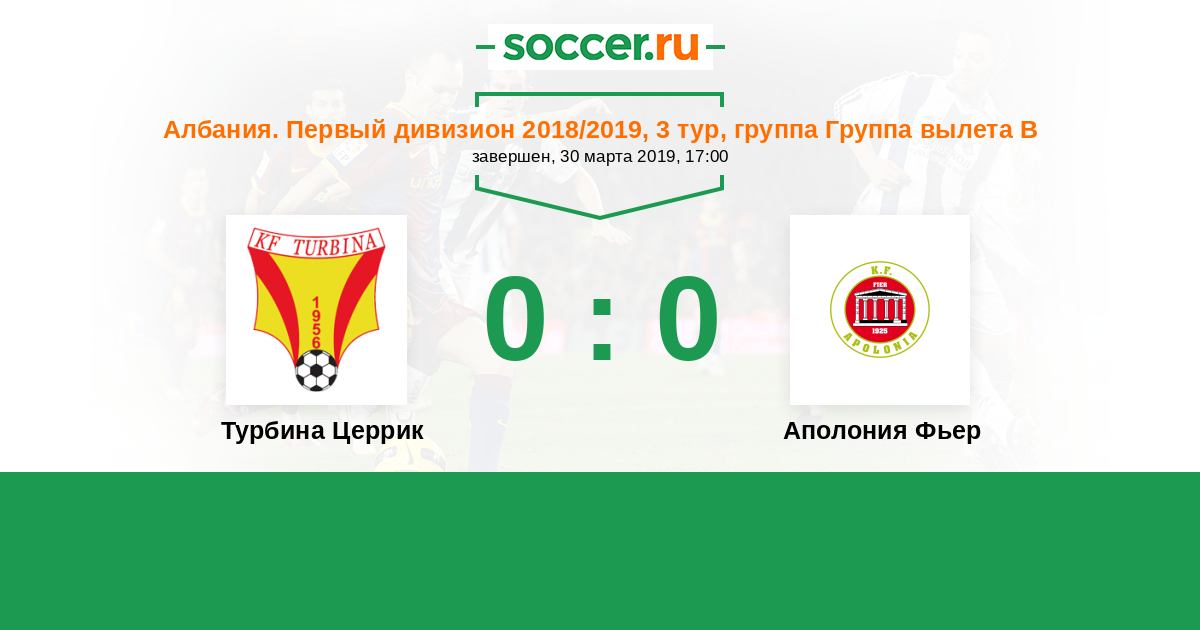 Албания. Первый дивизион 30.03.2019 Турбина Церрик Логотип футбольный клуб Турбина Церрик 0:0 Логотип футбольный клуб Аполония Фьер Аполония Фьер