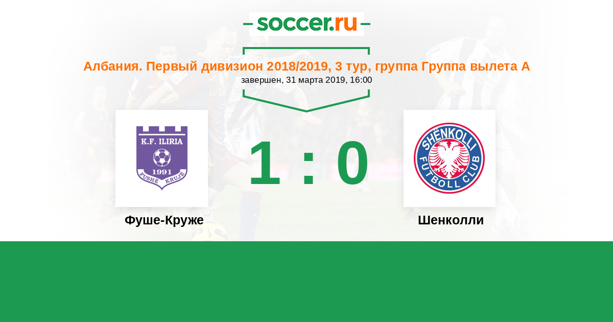 Албания. Первый дивизион 31.03.2019 Фуше-Круже Логотип футбольный клуб Фуше-Круже 1:0 Логотип футбольный клуб Шенколли (Леже) Шенколли