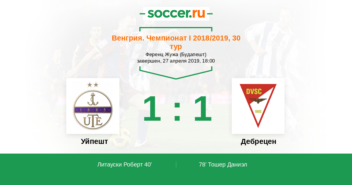 Протокол матча Уйпешт против Дебрецен