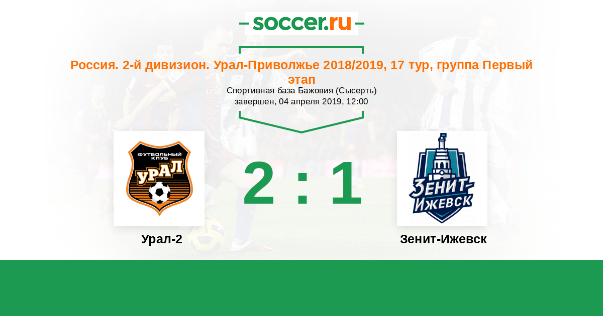 Россия. Вторая лига. Группа 4 16.04.2018 Зенит-Ижевск Логотип футбольный клуб Зенит-Ижевск 0:1 Логотип футбольный клуб Урал-2 (Екатеринбург) Урал-2