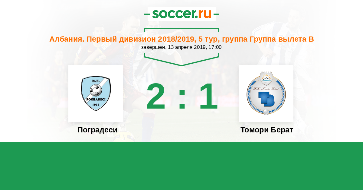 Албания. Первый дивизион 13.04.2019 Поградеси Логотип футбольный клуб Поградеси 2:1 Логотип футбольный клуб Томори Берат Томори Берат