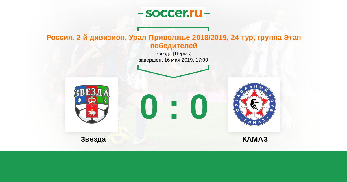 Россия. Вторая лига. Группа 4 11.09.2019 КАМАЗ Логотип футбольный клуб КАМАЗ (Набережные Челны) 1:0 Логотип футбольный клуб Звезда (Пермь) Звезда