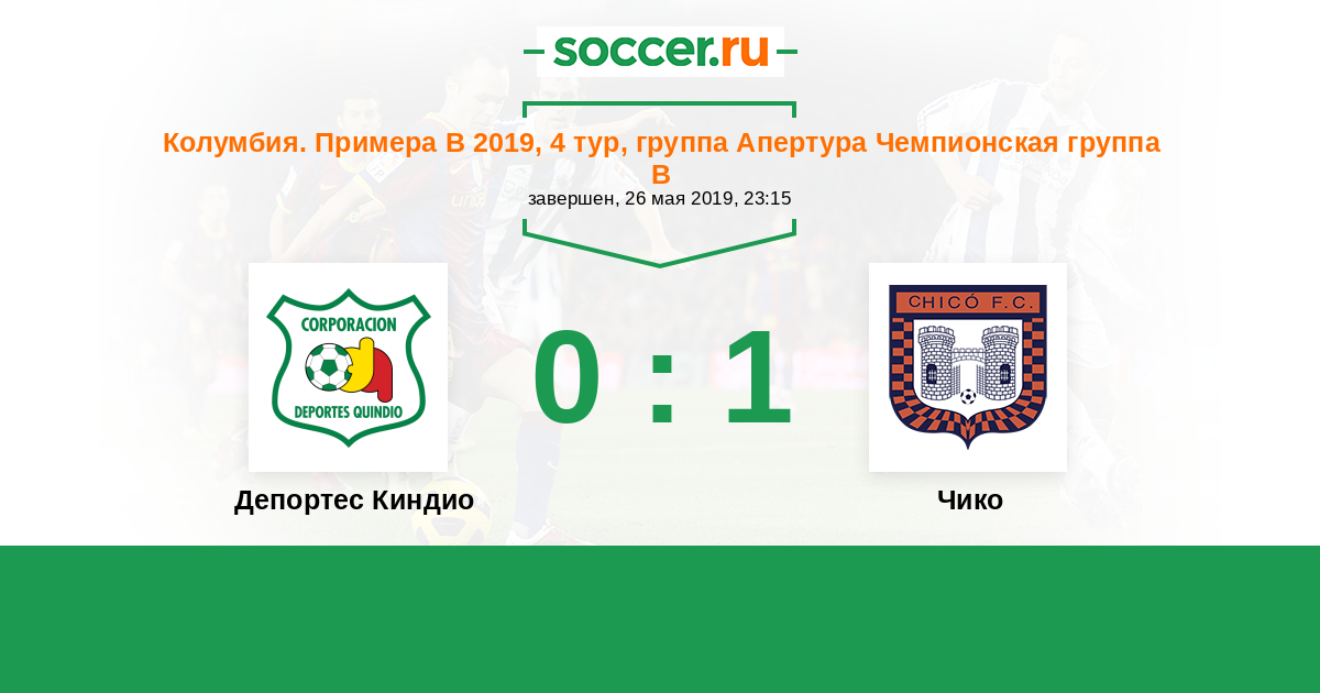 Колумбия. Примера B 21.05.2019 Чико Логотип футбольный клуб Чико (Тунха) 1:0 Логотип футбольный клуб Депортес Киндио (Армения) Депортес Киндио