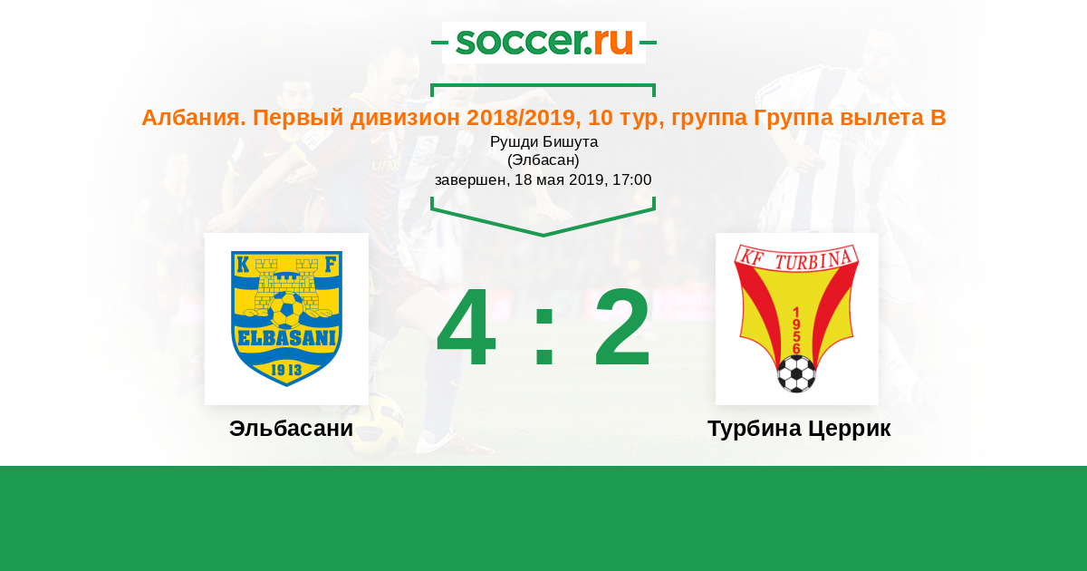 Албания. Первый дивизион 11.05.2019 Турбина Церрик Логотип футбольный клуб Турбина Церрик 4:1 Логотип футбольный клуб Томори Берат Томори Берат