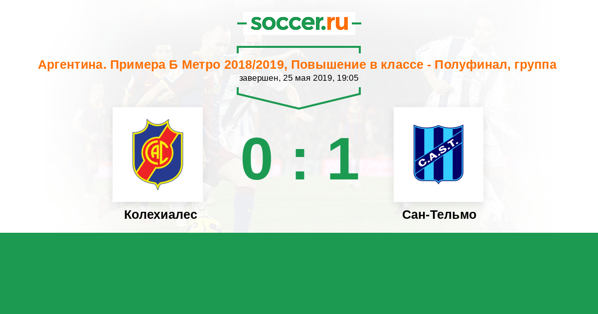 Аргентина. Примера Б Метро 01.06.2019 Сан-Тельмо Логотип футбольный клуб Сан-Тельмо 1:1 Логотип футбольный клуб Колехиалес (Висенте Лопес) Колехиалес