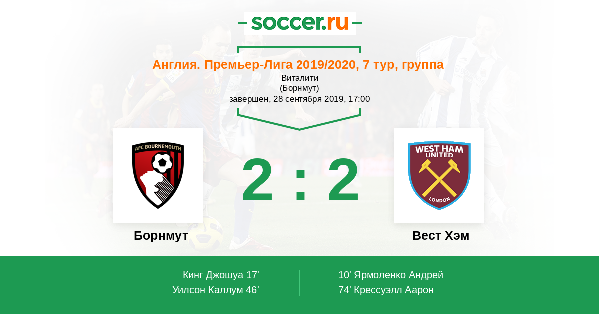 Протокол матча Борнмут против Вест Хэм
