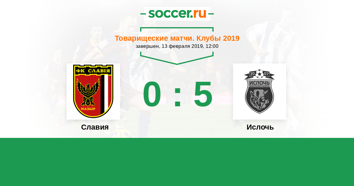Беларусь. Высшая лига 12.03.2021 Ислочь Логотип футбольный клуб Ислочь (Минск) 1:0 Логотип футбольный клуб Славия (Мозырь) Славия