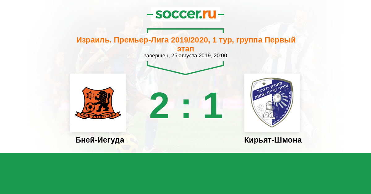 Израиль. Премьер-Лига 28.06.2020 Бней-Иегуда Логотип футбольный клуб Бней-Иегуда (Тель-Авив) 2:0 Логотип футбольный клуб Кирьят-Шмона Кирьят-Шмона