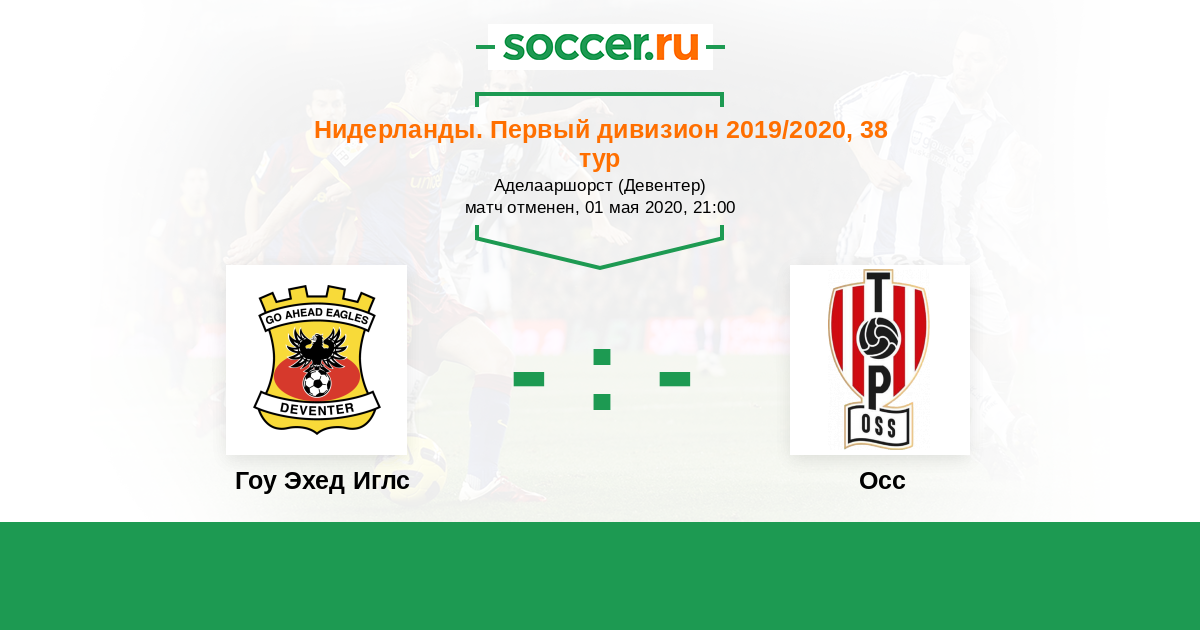Нидерланды. Первый дивизион 22.04.2019 Осс Логотип футбольный клуб Осс 1:0 Логотип футбольный клуб Гоу Эхед Иглс (Девентер) Гоу Эхед Иглс