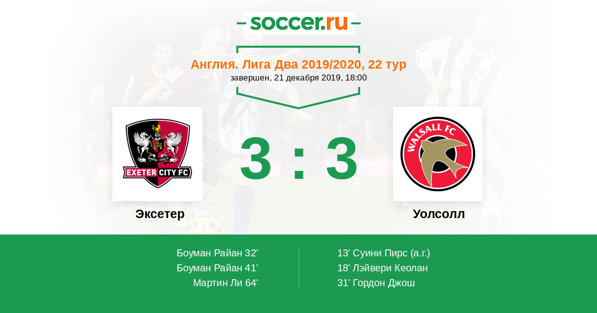 Протокол матча Эксетер против Уолсолл