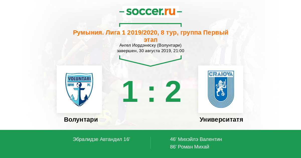 16' (1:0) Эбралидзе Автандил (44) (Капацина Михай (11))