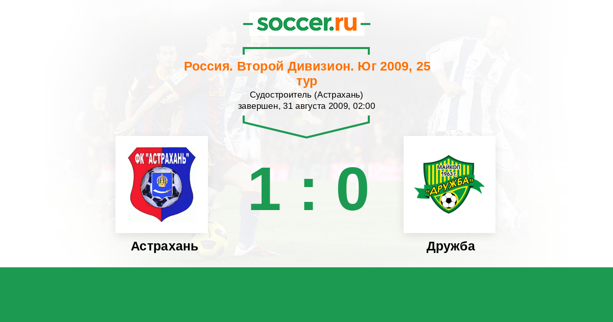 Россия. Вторая лига. Группа 1 13.05.2009 Дружба Логотип футбольный клуб Дружба (Майкоп) 0:1 Логотип футбольный клуб Астрахань Астрахань