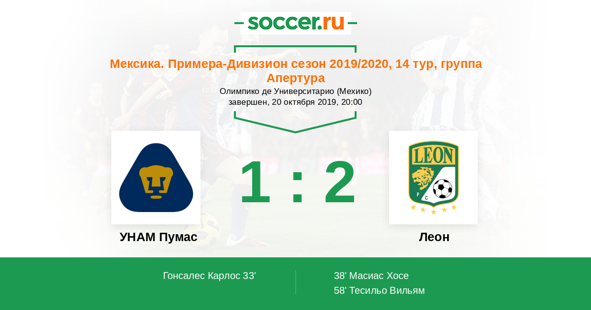 Протокол матча УНАМ Пумас против Леон