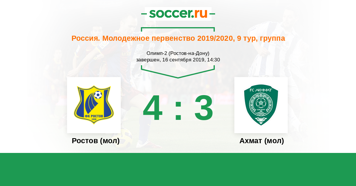 Россия. Премьер-Лига U21 04.10.2020 Ростов (мол) Логотип футбольный клуб Ростов (мол) (Ростов-на-Дону) 0:1 Логотип футбольный клуб Ахмат (мол) (Грозный) Ахмат (мол)