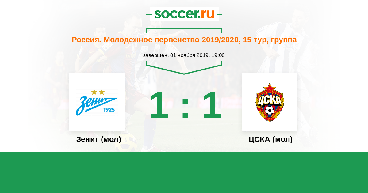 Россия. Премьер-Лига U21 10.11.2018 ЦСКА (мол) Логотип футбольный клуб ЦСКА (мол) (Москва) 1:1 Логотип футбольный клуб Зенит (мол) (Санкт-Петербург) Зенит (мол)